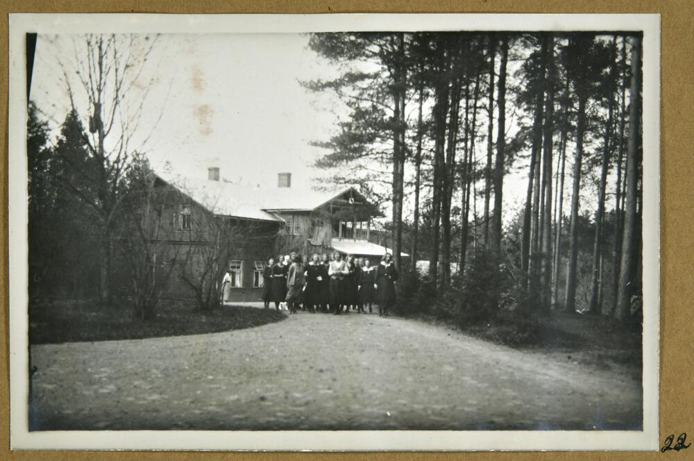 Bērzaines Valsts vidusskolas audzēkņi pēc sniegtā koncerta Latvijas Brīvības cīņu dalībieku, kara invalīdu pavadībā pa ceļu aiziet no Latvijas Sarkanā Krusta Cēsu sanatorijas.