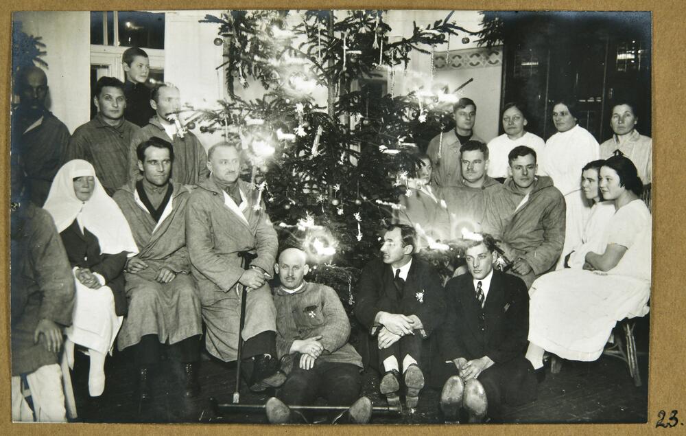 Latvijas Sarkanā Krusta Cēsu sanatorijas darbinieki un pacienti, Latvijas Brīvības cīņu dalībieki, kara invalīdi pie Ziemassvētku eglītes. Grupas foto.