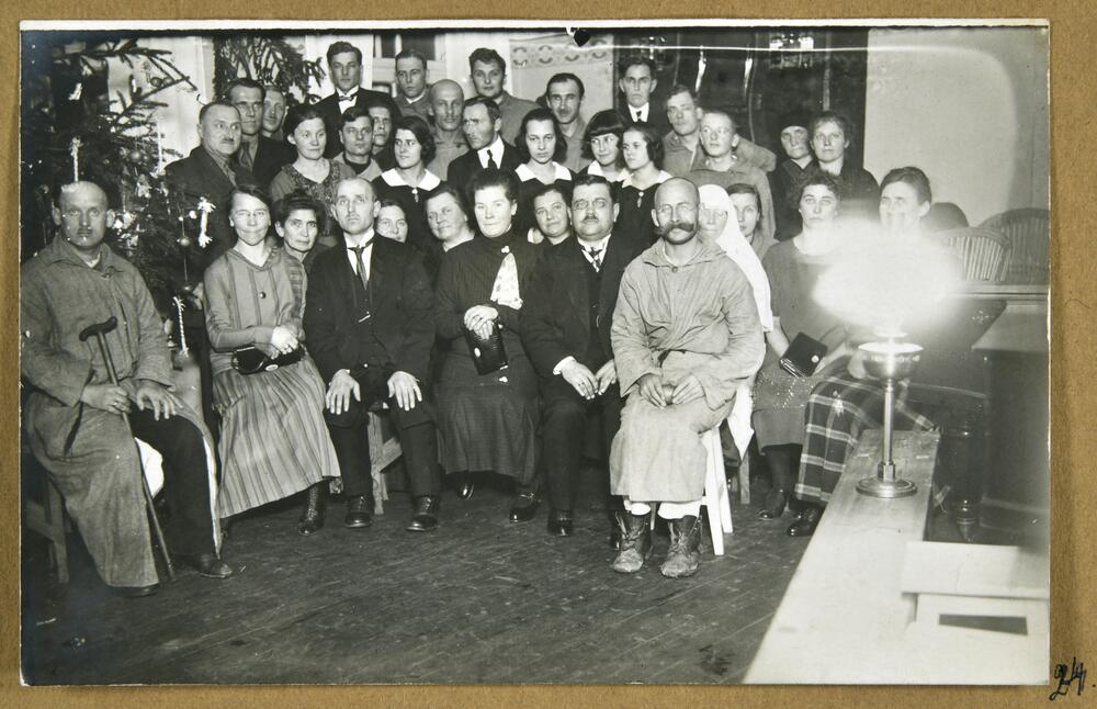 Latvijas Sarkanā Krusta Cēsu sanatorijas darbinieki un pacienti, Latvijas Brīvības cīņu dalībieki, kara invalīdi pēc Pirmo Ziemassvētku dievkalpojuma pie Ziemassvētku eglītes. Grupas foto.
