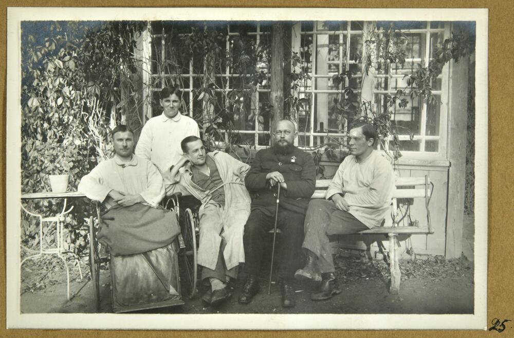 Latvijas Sarkanā Krusta Cēsu sanatorijas pacienti, Latvijas Brīvības cīņu dalībieki, kara invalīdi pie sanatorijas ēkas. Grupas foto.