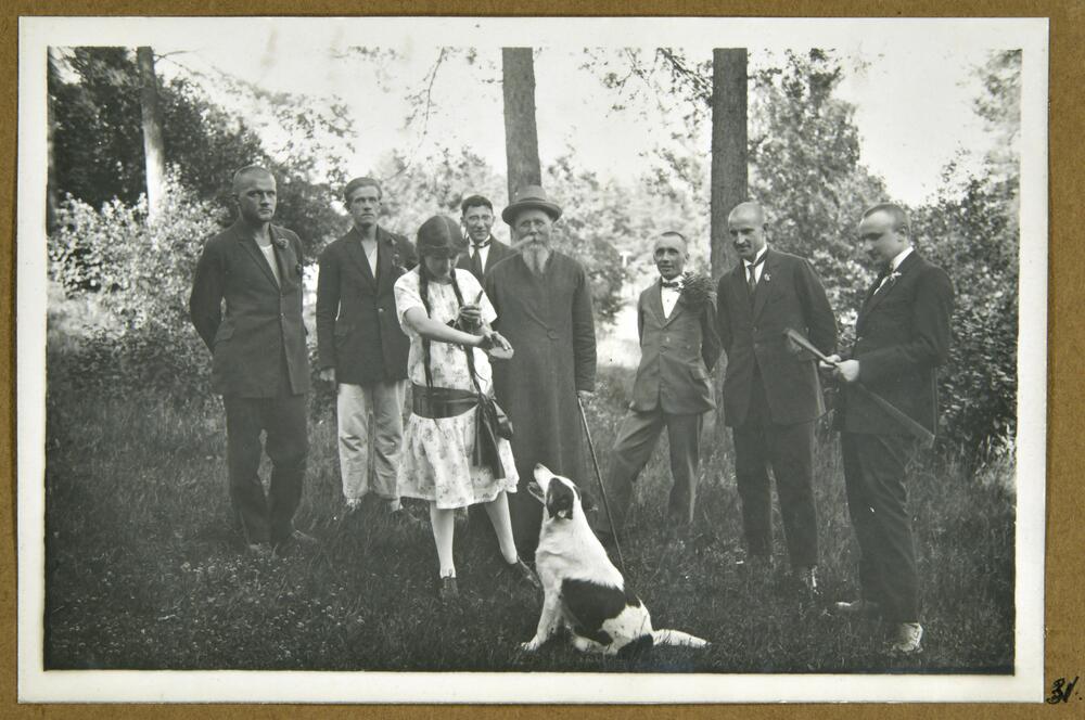 Latvijas Sarkanā Krusta Cēsu sanatorijas pacienti un darbinieki pastaigas laikā pie dabas sanatorijas apkārtnē ar suni. Grupas foto.