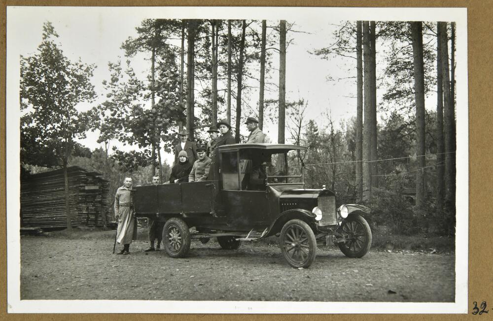 Latvijas Sarkanā Krusta Cēsu sanatorijas pacienti, veselākie Latvijas Brīvības cīņu dalībnieki, kara invalīdi pie smagās automašīnas pirms došanās uz 2. Saeimas (?) vēlēšanām.