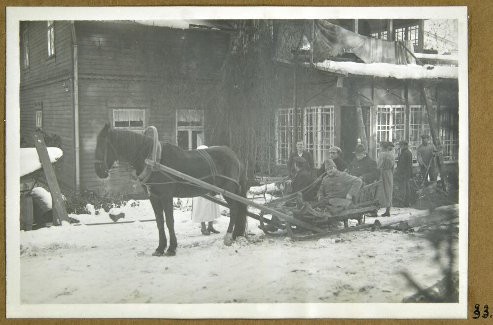 Latvijas Brīvības cīņu dalībnieki, kara invalīdi pie Latvijas Sarkanā Krusta Cēsu sanatorijas ēkas ziemā sēž zirga kamanās pirms došanās uz medicīniskās izmeklēšanas ārstu komisiju.