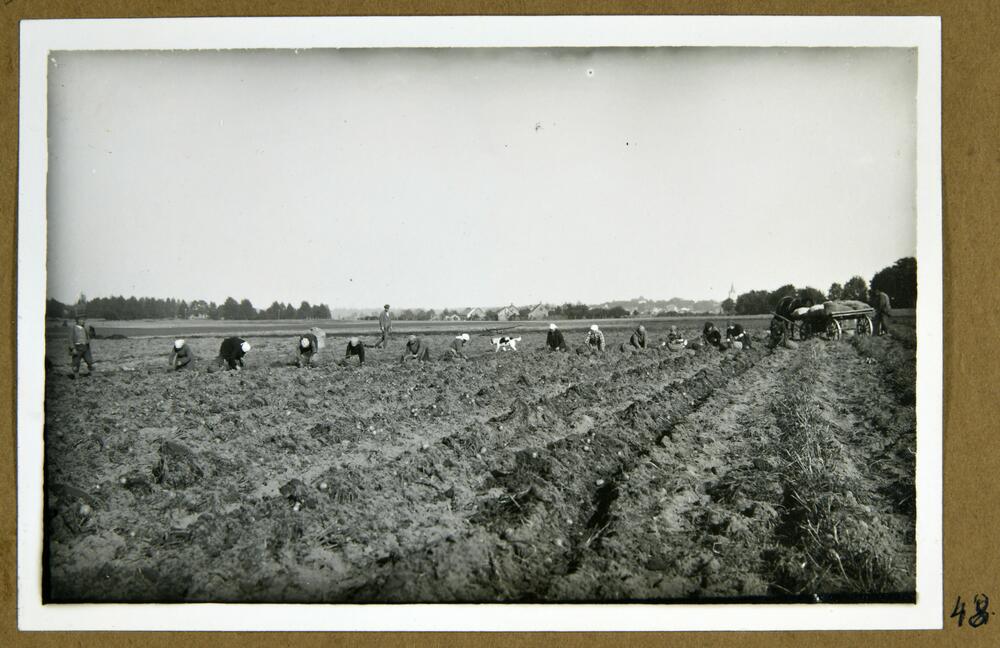 Skats uz kartupeļu novākšanu Latvijas Sarkanā Krusta Cēsu sanatorijas kartupeļu laukā.