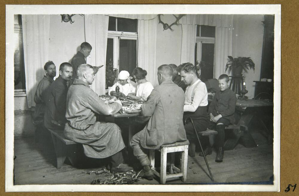 Latvijas Sarkanā Krusta Cēsu sanatorijas darbinieki un pacienti, kara invalīdi pie galda sagriež cigoriņus.