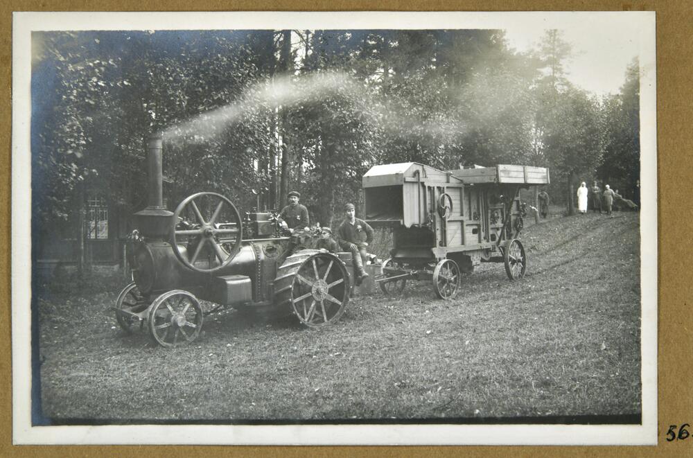 Tvaika kuļmašīna (dampis) pēc labības kulšanas aizbrauc no Latvijas Sarkanā Krusta Cēsu sanatorijas teritorijas.