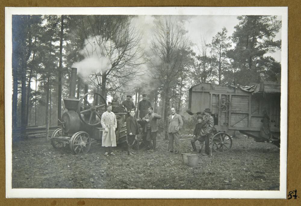 Latvijas Sarkanā Krusta Cēsu sanatorijas pacienti, kara invalīdi un darbinieki labības kulšanas laikā pie tvaika kuļmašīnas (dampis).