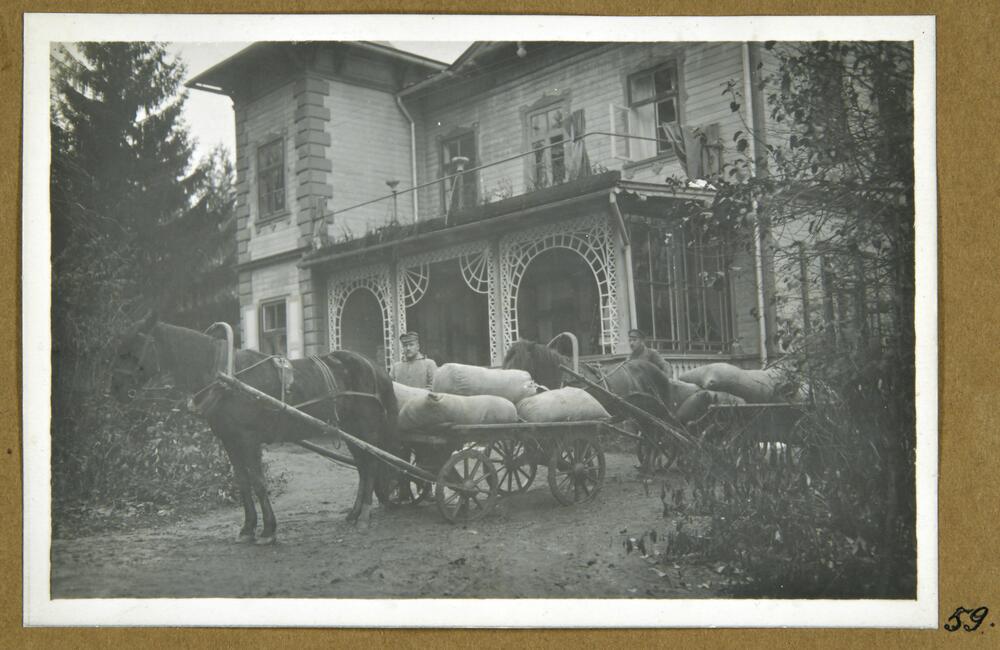 Latvijas Sarkanā Krusta Cēsu sanatorijā pie ēkas uz ceļa pirms došanās uz kalti redzami divi ar izkultās labības maisiem piekrauti zirgu vezumi.