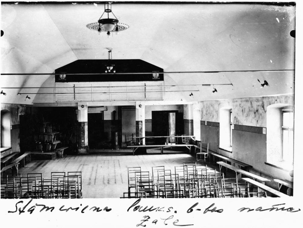Stāmerienas lauksaimniecības biedrības nama zāle. 1935. gadā Stāmerienas aizsargu nodaļa iegādājās namu no lauksaimniecības biedrības un ierīkoja Stāmerienas aizsargu namu.