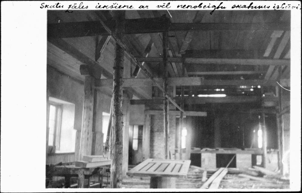 Valgundes tautas/ biedrības nama zāles iekšskats celtniecības laikā. Ēka pabeigta 1939. gadā.