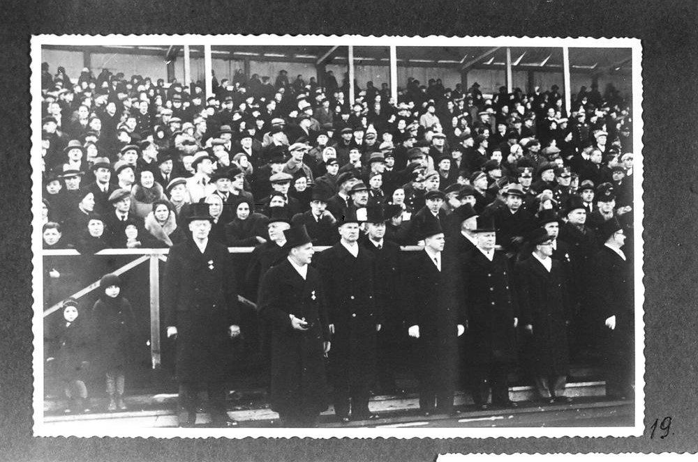 Latvijas valdības pārstāvji, Latvijas Armijas daļu parādes laikā, Uzvaras laukumā (tagad Uzvaras parks) par godu Latvijas Republikas proklamēšanas 20. gadadienas svinībām. Fonā redzama skatītāju tribīne.