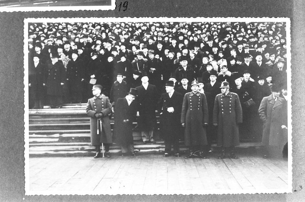 Skatītāju tribīnes, Latvijas Armijas daļu parādes laikā, Uzvaras laukumā (tagad Uzvaras parks) par godu Latvijas Republikas proklamēšanas 20. gadadienas svinībām. Pirmajās rindās redzami Latvijas armijas virspavēlnieki un parādes goda viesi.