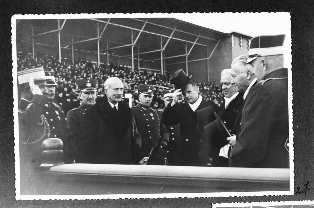 Latvijas armijas militārie pārstāvji un valdības amatpersonas Rīgas garnizona apakšnodaļas karavīru parādes laikā Uzvaras laukumā (tagad Uzvaras parks) par godu Latvijas Republikas proklamēšanas 20. gadadienas svinībām. Ārzemju viesi sagaida, no labās: 2. Latvijas Republikas Kara ministrs, ģenerālis Jānis Balodis, 3. Latvijas Valsts un Latvijas Republikas Ministru prezidents Kārlis Ulmanis, 4. Latvijas Republikas Ārlietu ministrs Vilhelms Munters.