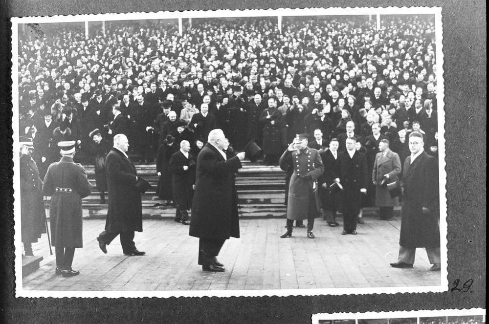 Latvijas armijas militārie pārstāvji un valdības amatpersonas Rīgas garnizona apakšnodaļas karavīru parādes laikā Uzvaras laukumā (tagad Uzvaras parks) par godu Latvijas Republikas proklamēšanas 20. gadadienas svinībām. Centrā redzams Latvijas Valsts prezidents un Latvijas Republikas Ministru prezidents Kārlis Ulmanis.