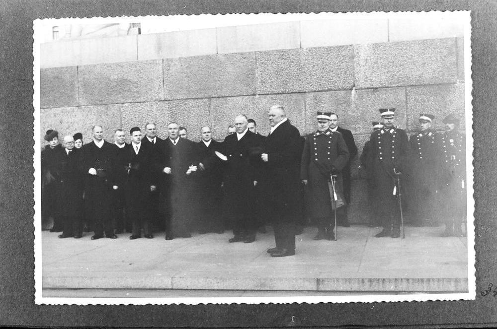 Latvijas valdības un armijas pārstāvji pie Brīvības pieminekļa Latvijas Republikas proklamēšanas 20. gadadienas svinību laikā. No kreisās: 2. Latvijas Valsts kancelejas direktors Dāvids Rudzītis, 4. Latvijas Republikas Izglītības ministrs Jūlijs Auškāps, 5. Latvijas Republikas Zemkopības ministrs Jānis Birznieks (aiz Auškāpa), 6. Latvijas Republikas Finansu ministrs Alfrēds Valdmanis, 7. Latvijas Republikas Izglītības ministra biedrs Jāzeps Čamanis, 8. bijušais Latvijas Valsts prezidents Alberts Kviesis, 9. Latvijas Republikas Tieslietu ministrs Hermanis Apsītis, 10. Latvijas Republikas Kara ministrs Jānis Balodis, 11. Latvijas Valsts prezidents un Latvijas Republikas Ministru prezidents Kārlis Ulmanis, 12. Latvijas Armijas komandieris Krišjānis Berķis, 13. Latvijas Armijas štāba komandieris Mārtiņš Hartmanis, 14. Rīgas garnizona priekšnieks Fricis Virsaitis.