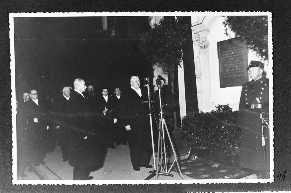 Latvijas Valsts prezidents, Latvijas Republikas Ministru prezidents Kārlis Ulmanis, atklājot Latvijas Republikas proklamēšanas akta piemiņas plāksni pie Latvijas Nacionālā teātra, par godu Latvijas Republikas proklamēšanas 20. gadadienas svinībām.