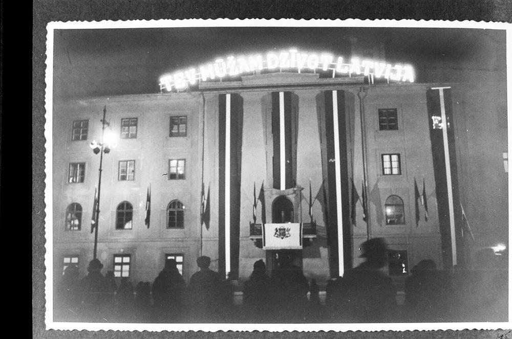 Iluminētā un izdekorētā Rīgas pils ēka par godu Latvijas Republikas proklamēšanas 20. gadadienas svinībām. Pils dzegu rotā iluminēts uzraksts "Tev mūžam dzīvot Latvija".