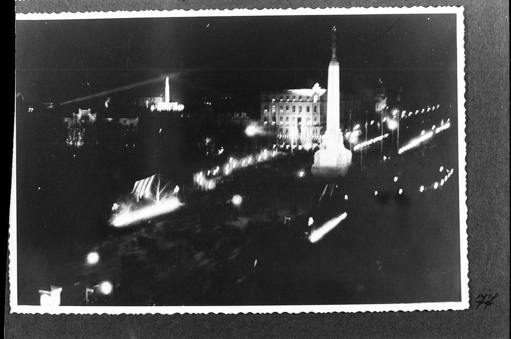 Izgaismotais Brīvības piemineklis un Brīvības iela par godu Latvijas Republikas proklamēšanas 20. gadadienas svinībām.
