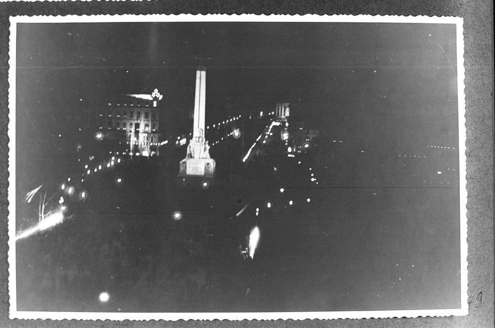 Izgaismotais Brīvības piemineklis un Brīvības iela par godu Latvijas Republikas proklamēšanas 20. gadadienas svinībām.