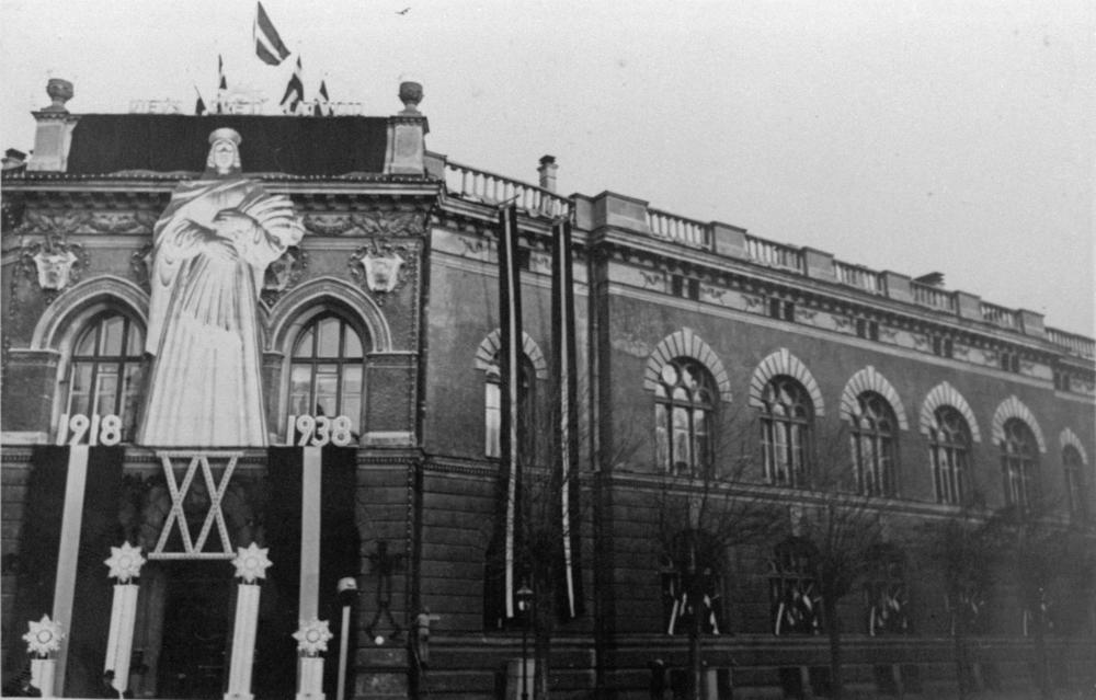 Izdekorētā Latvijas Bankas ēka par godu Latvijas Republikas proklamēšanas 20. gadadienas svinībām.