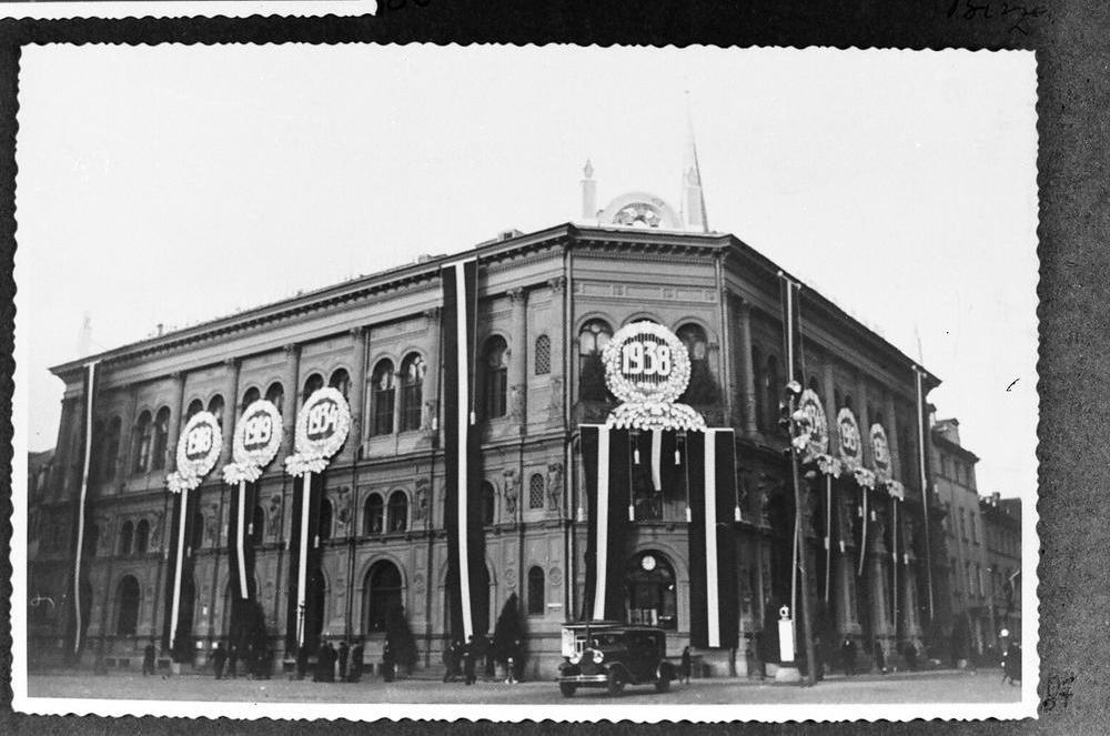 Izdekorētā Rīgas Biržas ēka par godu Latvijas Republikas proklamēšanas 20. gadadienas svinībām.