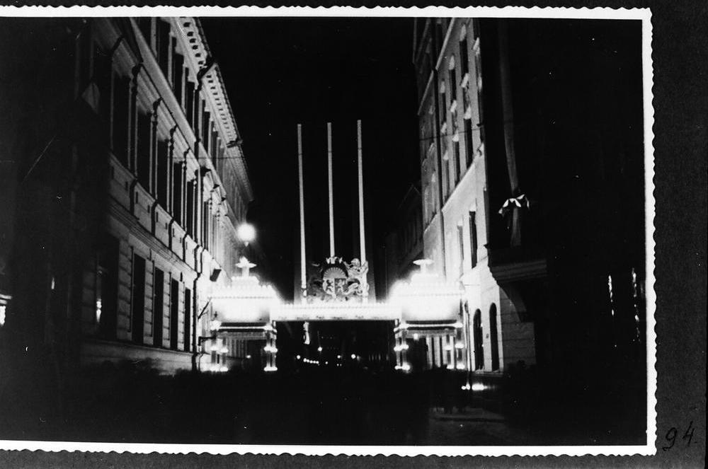 Izdekorētā un izgaismotā Pils iela par godu Latvijas Republikas proklamēšanas 20. gadadienas svinībām. Pa kreisi atrodas Finanšu ministrijas Tiešo nodokļu departamenta ēka Pils ielā 12.