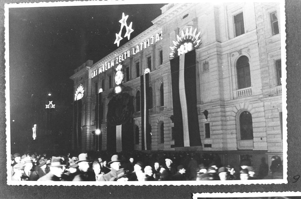 Izdekorētā un iluminētā Latvijas Valsts tehnikuma ēka par godu Latvijas Republikas proklamēšanas 20. gadadienas svinībām. Uz ēkas fasādes redzams iluminēts uzraksts "Lai mūžam zeltu Latvija".