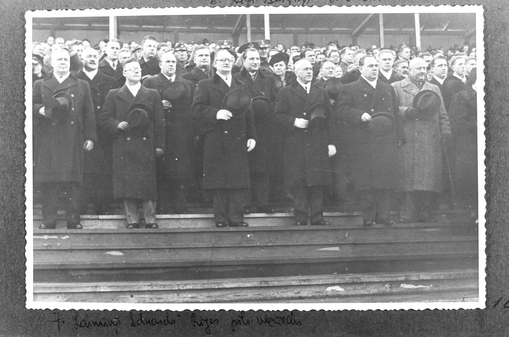 Latvijas Armijas daļu parāde Uzvaras laukumā par godu Latvijas Republikas proklamēšanas 20. gadadienas svinībām. Latvijas valdības tribīnē no kreisās: 1. Latvijas Republikas Tautas labklājības ministrs Jānis Volants, 2. Latvijas Republikas Zemkopības ministrs Jānis Birznieks, 4. Latvijas Republikas tieslietu ministrs Hermanis Apsītis, 6. Latvijas Republikas Sabiedrisko lietu ministrs Alfrēds Bērziņš, 7. Rīgas pilsētas vecākais Eduards Laimiņš.