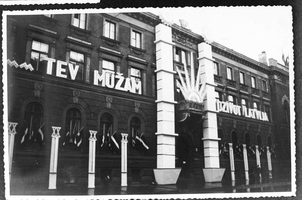 Iluminētā Latvijas Bankas ēka (no Krišjāņa Valdemāra ielas puses) par godu Latvijas Republikas proklamēšanas 20. gadadienas svinībām. Ēku rotā iluminēts uzraksts- "Tev mūžam dzīvot Latvija".