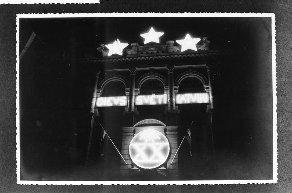 Iluminēta ēkas fasāde par godu Latvijas Republikas proklamēšanas 20. gadadienas svinībām. Uz ēkas redzams iluminēts uzraksts "Dievs svētī Latviju".