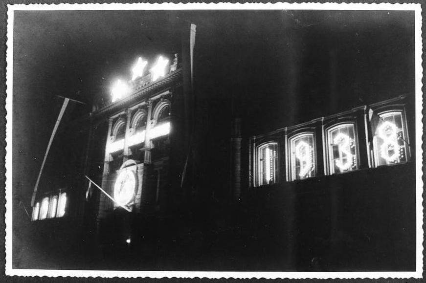 Iluminēta ēka par godu Latvijas Republikas proklamēšanas 20. gadadienas svinībām.