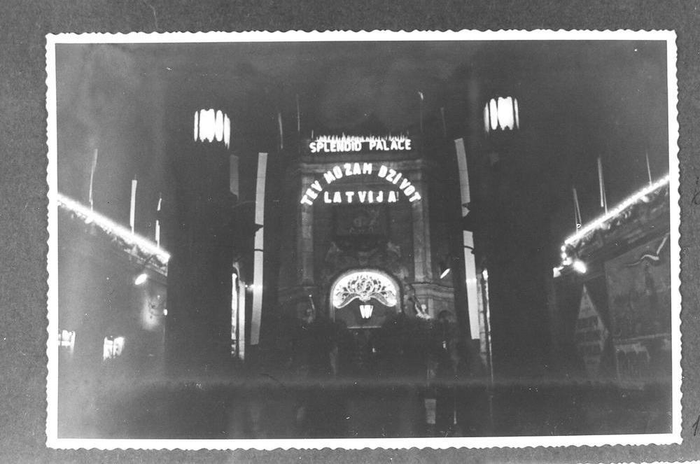 Iluminētā kinoteātra "Splendid Palace'' ēka par godu Latvijas Republikas proklamēšanas 20. gadadienas svinībām. Uz ēkas iluminēts uzraksts "Tev mūžam dzīvot Latvija".