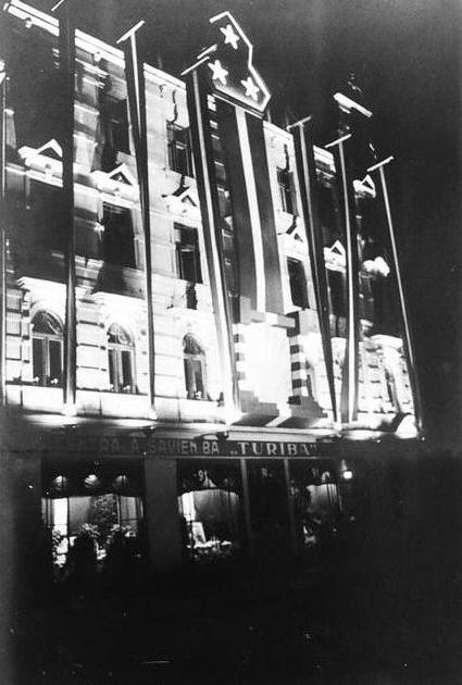 Izdekorētā centrālās savienības "Turība" ēka par godu Latvijas Republikas proklamēšanas 20. gadadienas svinībām.