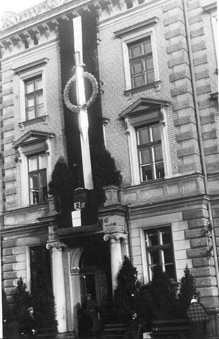 Izdekorētā Rīgas Prefektūras ēka (Aspazijas bulvāris 7) par godu Latvijas Republikas proklamēšanas 20. gadadienas svinībām.