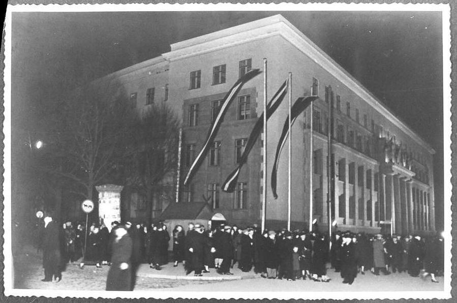 Cilvēki pulcējas pie izdekorētās Latvijas Tiesu pils ēkas (Brīvības bulvārī 36) par godu Latvijas Republikas proklamēšanas 20. gadadienas svinībām.