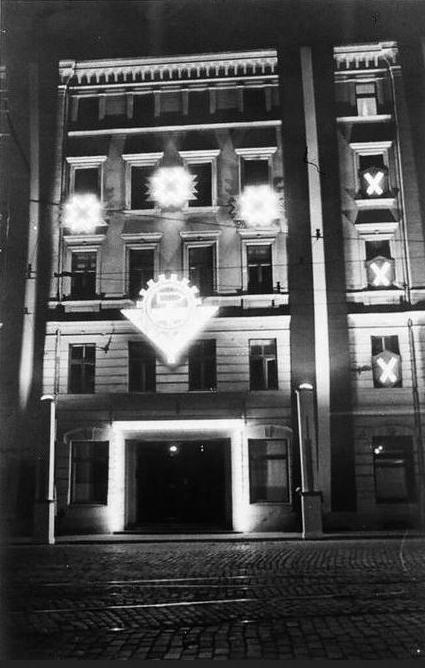 Iluminētā un izdekorētā ēka par godu Latvijas Republikas proklamēšanas 20. gadadienas svinībām.