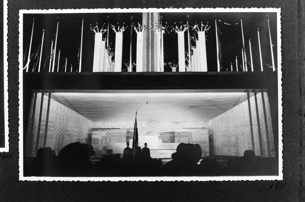 Skatītāji pie izgaismotās Latvijas Republikas proklamēšanas 20. gadadienai veltītās estrādes Vienības laukumā (tagad Esplanāde) netālu no Rīgas pilsētas mākslas muzeja.