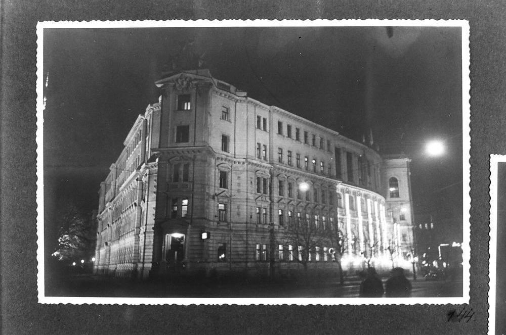 Izgaismotā Latvijas Pasta Galvenās pārvaldes ēka (tagad Latvijas Universitātes Ekonomikas un vadības fakultāte) par godu Latvijas Republikas proklamēšanas 20. gadadienas svinībām. Latvijas Pasta Galvenajā pārvaldes ēkā no 1925. gadā atradies arī Rīgas radiofons.