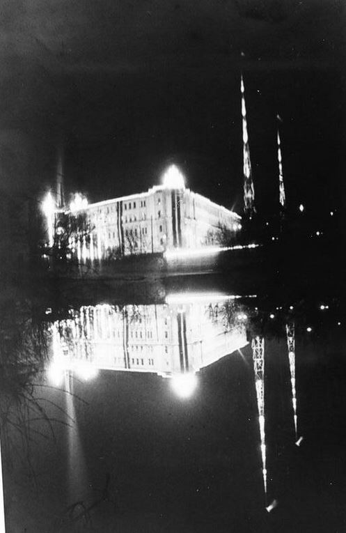 Par godu Latvijas Republikas proklamēšanas 20. gadadienas svinībām izgaismotā Latvijas Pasta un telegrāfa departamenta galvenā ēka Aspazijas bulvārī 15 (pēc tagadējās numerācijas 5) un Latvijas Radiofona Rīgas raidītāja antenas torņi kanālmalā.