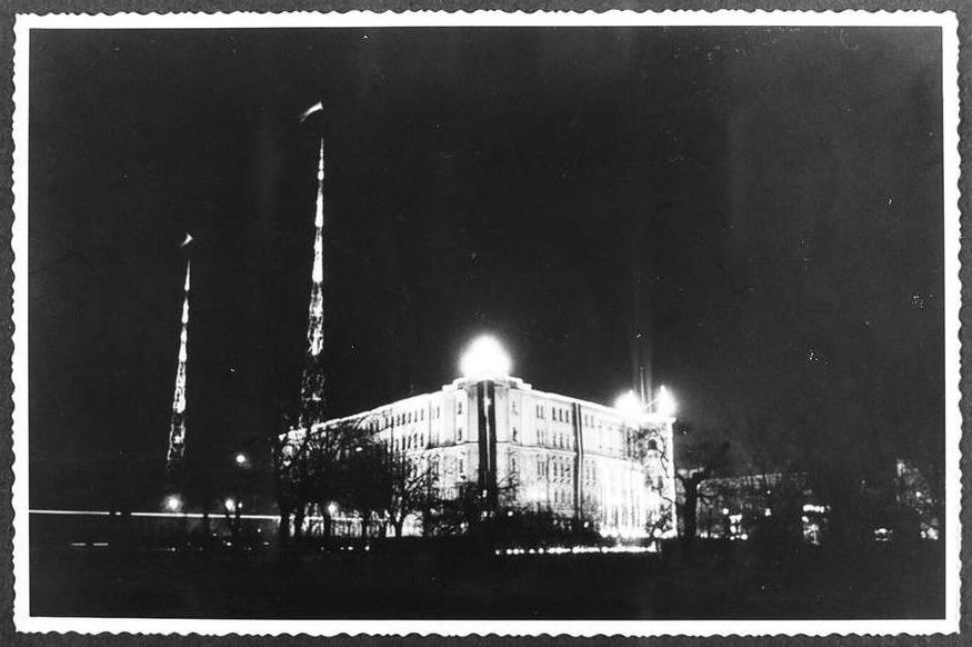 Par godu Latvijas Republikas proklamēšanas 20. gadadienas svinībām izgaismotā Latvijas Pasta un telegrāfa departamenta galvenā ēka Aspazijas bulvārī 15 (pēc tagadējās numerācijas 5) un Latvijas Radiofona Rīgas raidītāja antenas torņi kanālmalā.