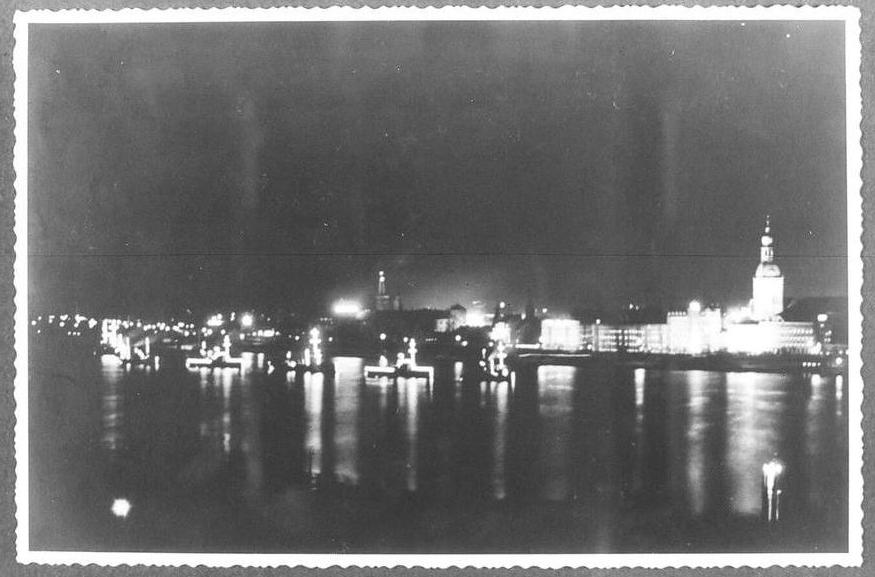 Rīgas panorāma. Daugavā redzami Latvijas jūras kara flotes (arī Jūras krasta apsardzes eskadra) iluminētie kuģi par godu Latvijas Republikas proklamēšanas 20. gadadienas svinībām.