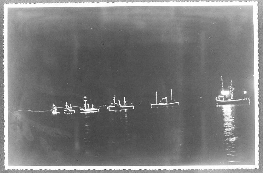 Latvijas jūras kara flotes (arī Jūras krasta apsardzes eskadra) iluminētie kuģi par godu Latvijas Republikas proklamēšanas 20. gadadienas svinībām.