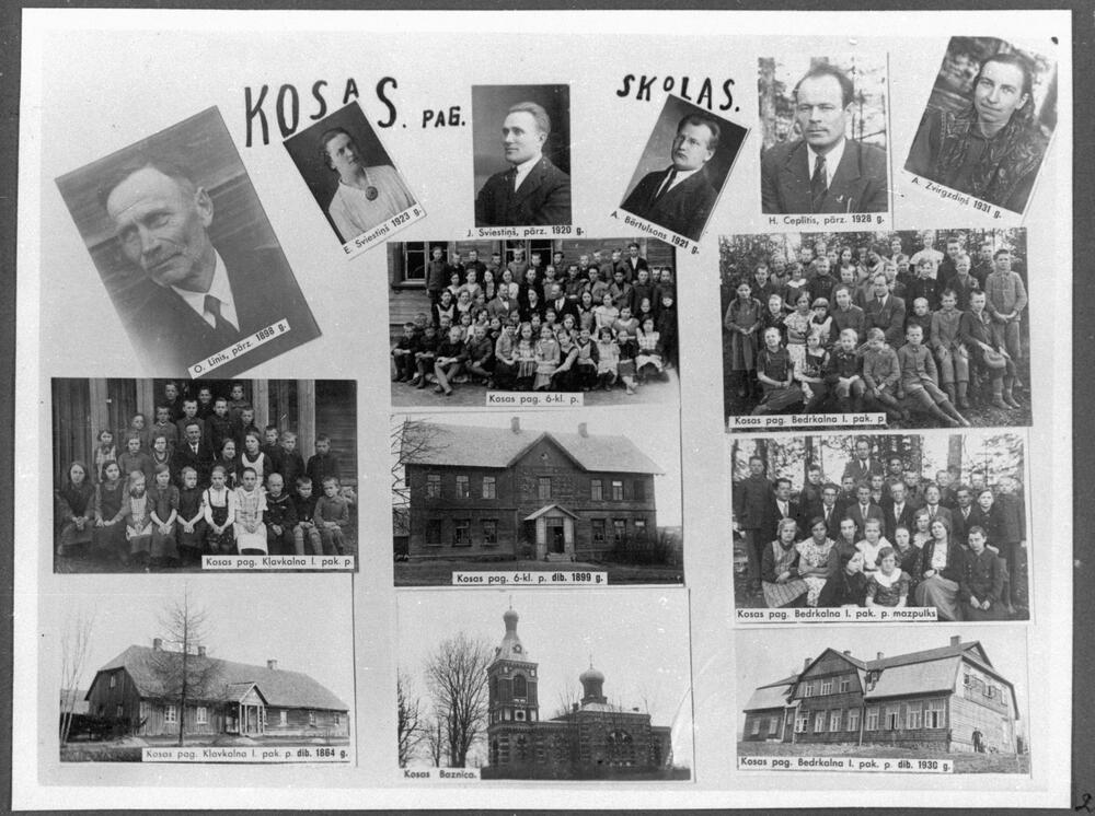 Cēsu apriņķa Kosas pagasta skolas un skolu darbinieki. Augšējā 1. rindā no kreisās: 1. Kosas pagasta Kļavkalna I pakāpes pamatskolas pārzinis O. Līnis, 2. Kosas pagasta 6 klašu pamatskolas skolotāja E. Sviestiņa, 3. Kosas pagasta 6 klašu pamatskolas pārzinis J. Sviestiņš, 4. Kosas pagasta 6 klašu pamatskolas skolotājs A. Bērtulsons, 5. Kosas pagasta Bedrkalna I pakāpes pamatskolas pārzinis H. Ceplītis, 6. Kosas pagasta Bedrkalna I pakāpes pamatskolas skolotāja A. Zvirgzdiņa. 2. rindā no kreisās: 1. (centrā) Kosas pagasta 6 klašu pamatskolas audzēkņi un skolotāji, 2. Kosas pagasta Bedrkalna I pakāpes pamatskolas audzēkņi un skolotāji. 3. rindā no kreisās: 1. Kosas pagasta Kļavkalna I pakāpes pamatskolas audzēkņi un skolotāji, 2. Kosas pagasta 6 klašu pamatskolas ēka, 3. Kosas pagasta Bedrkalna I pakāpes pamatskolas mazpulks. 4. rindā no kreisās: 1. Kosas pagasta Kļavkalna I pakāpes pamatskolas ēka, 2. Kosas baznīca, 3. Kosas pagasta Bedrkalna I pakāpes pamatskolas ēka. Fotomontāža.