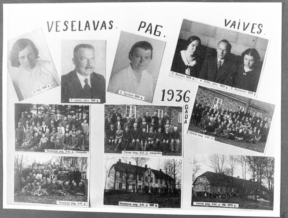 Cēsu apriņķa Veselavas un Vaives pagasta skolas. Augšējā 1. rindā no kreisās: 1. Veselavas pagasta 6 klašu pamatskolas skolotāja E. Pēča, 2. Veselavas pagasta 6 klašu pamatskolas pārzinis P. Lapiņš, 3. Veselavas pagasta 6 klašu pamatskolas skolotāja Z. Sprance, 4. Vaives pagasta 6 klašu pamatskolas skolotāji no kreisās: E. Rencēna, A. Stāks, Ē. Reinbaha, 2. rindā no kreisās: 1. Veselavas pagasta 6 klašu pamatskolas mazpulks, 2. Vaives pagasta 6 klašu pamatskolas mazpulks, 3. Vaives pagasta 6 klašu pamatskolas audzēkņi un skolotāji. 3. rindā no kreisās: 1. Veselavas pagasta 6 klašu pamatskolas audzēkņi un skolotāji, 2. Veselavas pagasta 6 klašu pamatskolas ēka, 3. Vaives pagasta 6 klašu pamatskolas ēka. Fotomontāža.