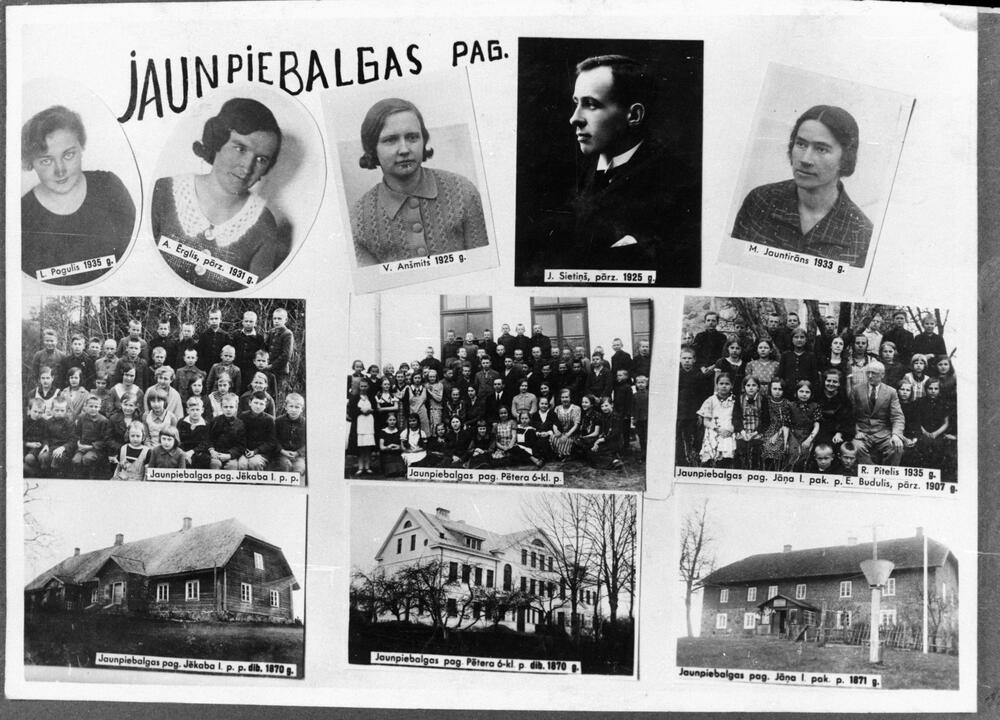 Cēsu apriņķa Jaunpiebalgas pagasta skolas un skolu darbinieki. Augšējā 1. rindā no kreisās: 1. Jaunpiebalgas pagasta Jēkaba I pakāpes pamatskolas skolotāja L. Pogule, 2. Jaunpiebalgas pagasta Jēkaba I pakāpes pamatskolas pārzine Angelika Ērgle, 3. Jaunpiebalgas pagasta Pētera 6 klašu pamatskolas skolotāja V. Anšmite, 4. Jaunpiebalgas pagasta Pētera 6 klašu pamatskolas pārzinis J. Sietiņš, 5. Jaunpiebalgas pagasta Jāņa 6 klašu pamatskolas skolotāja M. Jauntirāne. 2. rindā no kreisās: 1. Jaunpiebalgas pagasta Jēkaba I pakāpes pamatskolas audzēkņi un skolotāji, 2. Jaunpiebalgas pagasta Pētera 6 klašu pamatskolas audzēkņi un skolotāji, 3. Jaunpiebalgas pagasta Jāņa I pakāpes pamatskolas audzēkņi un skolotāji, centrā skolotāja Rita Pitele un skolas pārzinis Emīls Budulis. 3. rindā no kreisās: 1. Jaunpiebalgas pagasta Jēkaba I pakāpes pamatskolas ēka, 2. Jaunpiebalgas pagasta Pētera 6 klašu pamatskolas ēka, 3. Jaunpiebalgas pagasta Jāņa I pakāpes pamatskolas ēka. Fotomontāža.