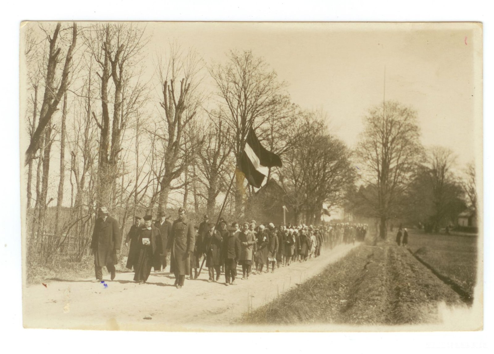 Iedzīvotāji gājienā ar Latvijas Republikas karogu 20. gadsimta 20. gados. Gājienu vada mācītājs un citas nozīmīgas personas