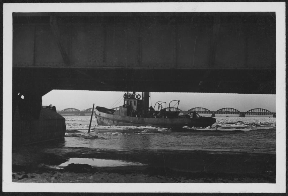 Velkonis pārvieto Rīgas pontonu tilta fragmentu pa Daugavu ledus iešanas laikā. Fonā redzams Valdemāra tilts (atklāts 1945. gada 15. martā).