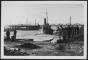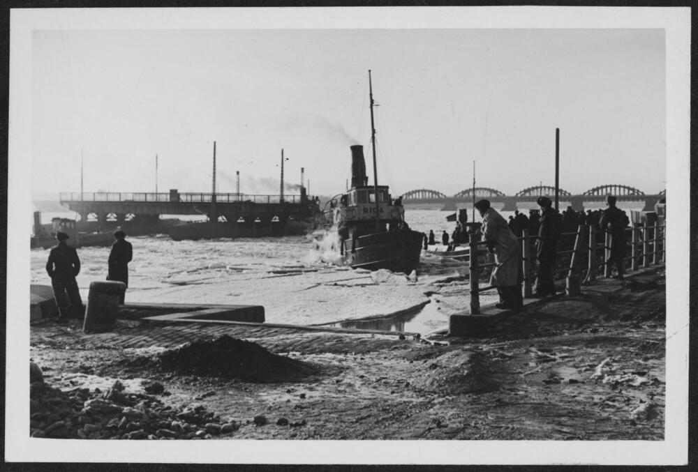 Velkonis pārvieto Rīgas pontonu tilta fragmentu pa Daugavu ledus iešanas laikā. Fonā redzams Valdemāra tilts (atklāts 1945. gada 15. martā).