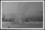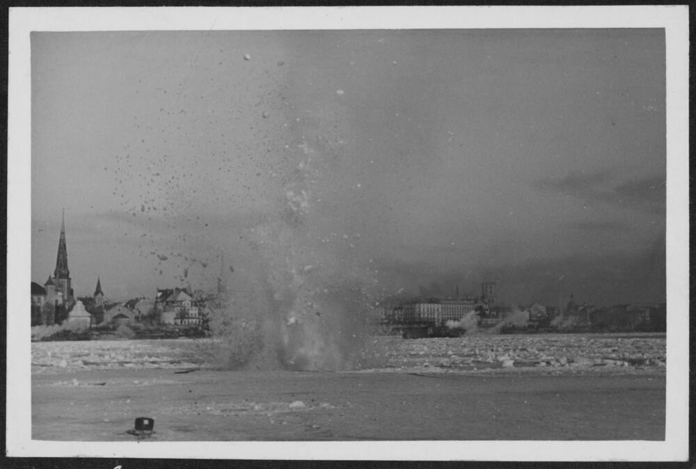 Ledus spridzināšana Daugavā, sprāgstvielu detonācija. Fonā redzama Vecrīgas ainava.