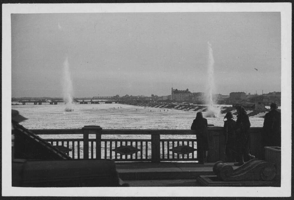 Cilvēki uz Valdemāra tilta (atklāts 1945. gada 15. martā) vēro ledus spridzināšanu Daugavā.